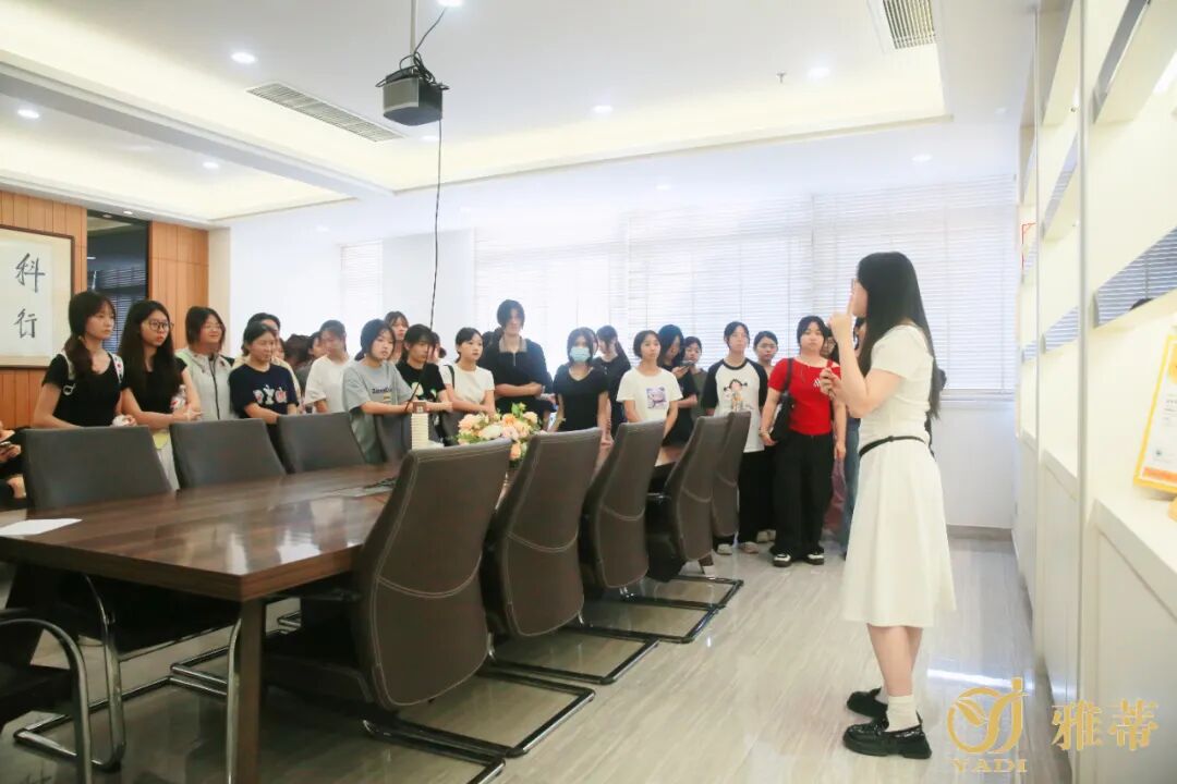 从生产车间到产品展厅,从荣誉讲解到细节答疑,雅蒂公司为学子们打造了全维度的学习场景:在生产线前,大家近距离观察化妆品从原料到成品的全流程,见证“匠心”如何融入每一个生产环节;在产品展厅,雅蒂公司二十年来的创新成果一一陈列,让学子们直观感受美业技术迭代的速度与力量;在交流环节,雅蒂公司导师团队倾囊相授,从行业趋势到职业规划,从技术要点到岗位需求,用真实经验为学子们拨开职业迷雾。